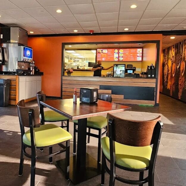Braza Chicken implemented a booth-centered layout paired with durable table surfaces and commercial-grade bases. This approach creates structured seating zones while maintaining flexibility across different group sizes.
