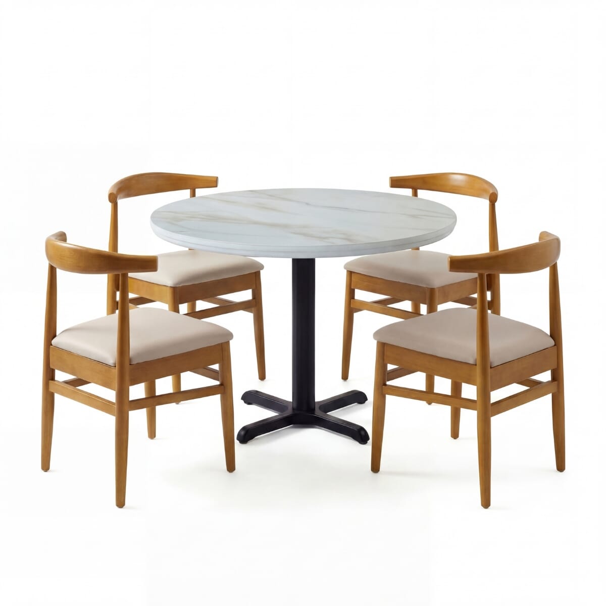 This set features a 1-inch thick polished white sintered stone table top with elegant gold veining and four stackable natural elm chairs. Built for busy restaurants, the scratch- and UV-resistant surface ensures long-lasting beauty. Chairs offer ergonomic support with customizable upholstery and reinforced joinery. A cast iron and steel base provides durability, while floor glides protect surfaces. With its timeless look and compact footprint, this set is perfect for cafés, bistros, and casual dining venues aiming for stylish efficiency.Talk with an Expert.